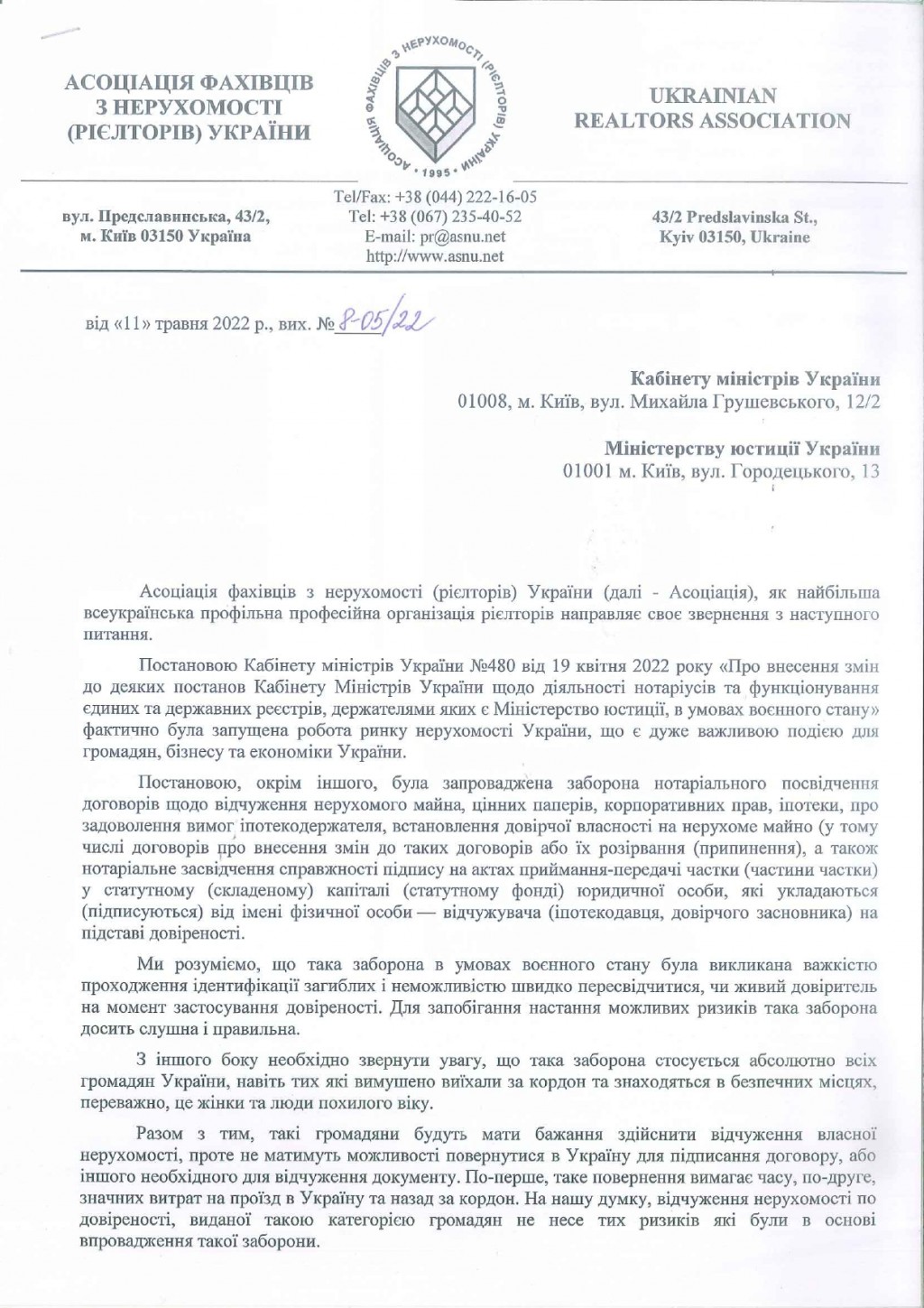 Постановою Кабінету міністрів України №480 від 19 квітня 2022 року «Про внесення змін до деяких постанов Кабінету Міністрів України щодо діяльності нотаріусів та функціонування єдиних та державних реєстрів, держателями яких є Міністерство юстиції, в умовах воєнного стану» фактично була запущена робота ринку нерухомості України, що є дуже важливою подією для громадян, бізнесу та економіки України.