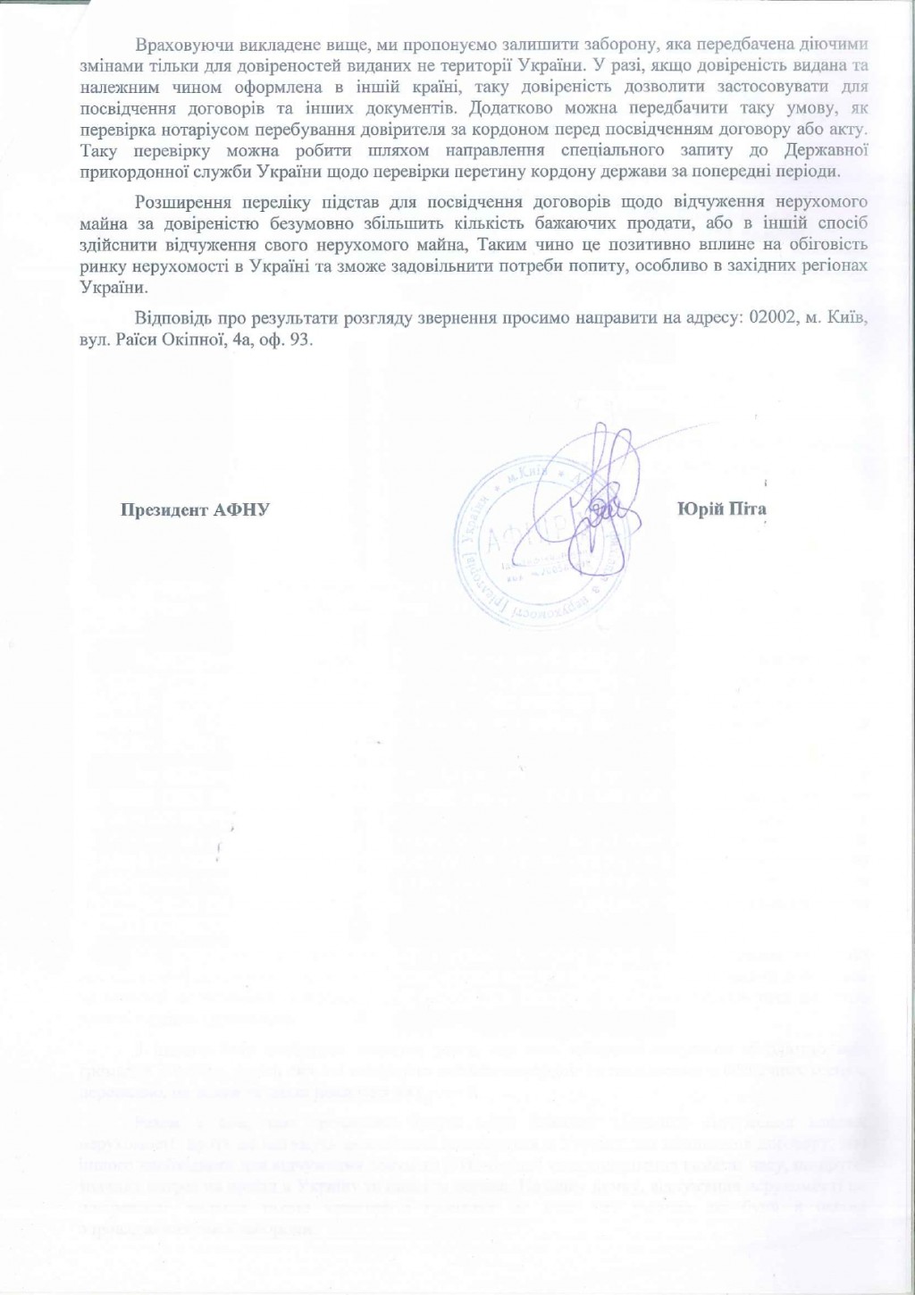 Проте, велика кількість власників (співвласників) нерухомого майна вимушено виїхали за кордон та знаходяться в безпечних місцях і для такої категорії громадян немає таких ризиків, що були в основі впровадження такої заборони. Отже Асоціація пропонує переглянути випадки такої заборони та для таких громадян дозволити використання довіреностей. Відповідне пом’якшення збільшить кількість бажаючих продати, або в іншій спосіб здійснити відчуження свого нерухомого майна. Таким чином це позитивно вплине на обіговість ринку нерухомості в Україні, зможе задовільнити потреби попиту та збільшити кількість угод.