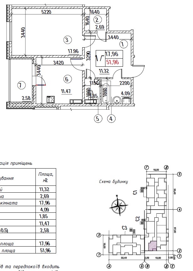 Загальна площа: 52 кв.м, житлова – 18 кв.м, кухня – 11.5 кв.м.