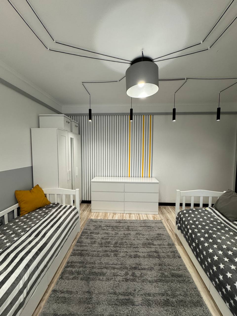 Дитяча кімната облаштована для двох діток: ліжка, робочі зони біля вікна, багато світла та простору.