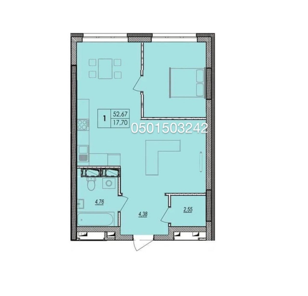 Загальна площа - 52,67 м2, кухня-вітальня 15,54 м2.