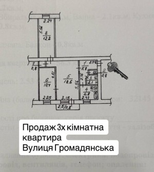 Загальна площа – 56,3 м.кв., житлова – 41,2 м.кв. (18,6+12,2+10,4), площа кухні – 4,8 м. кв.