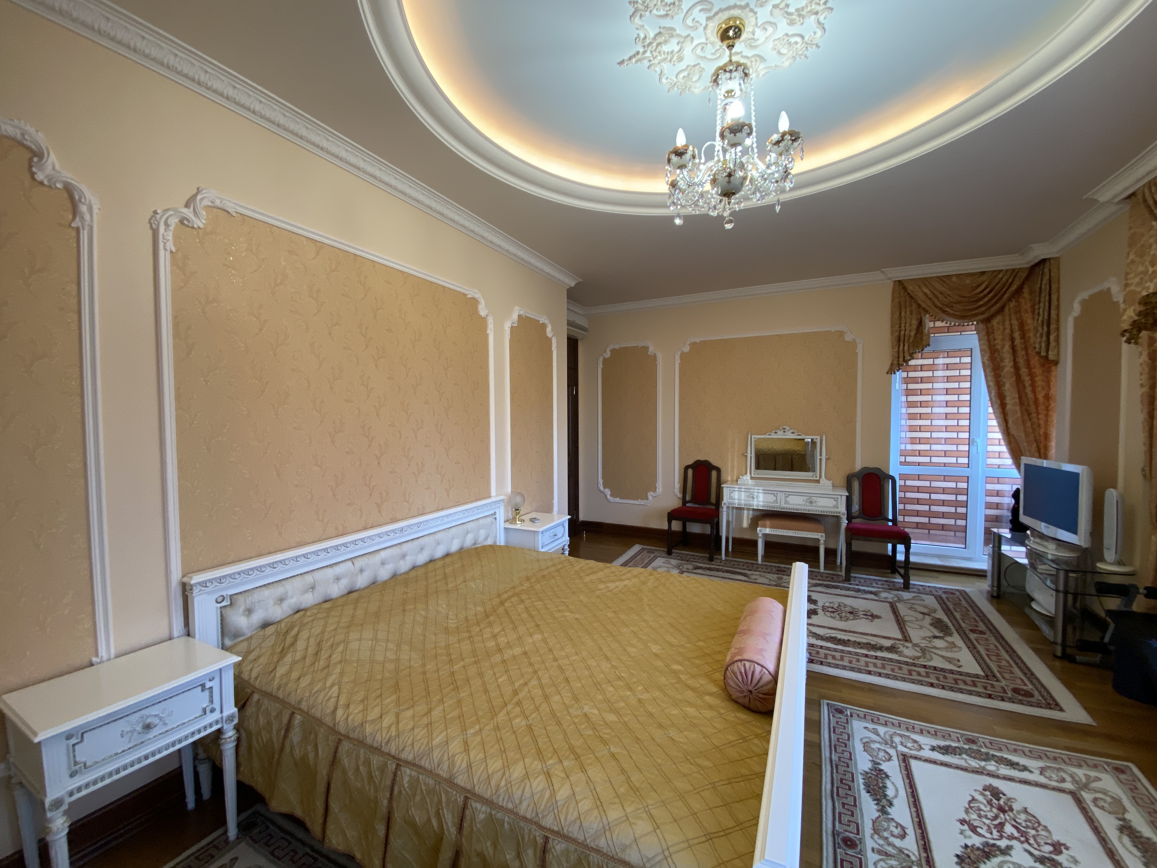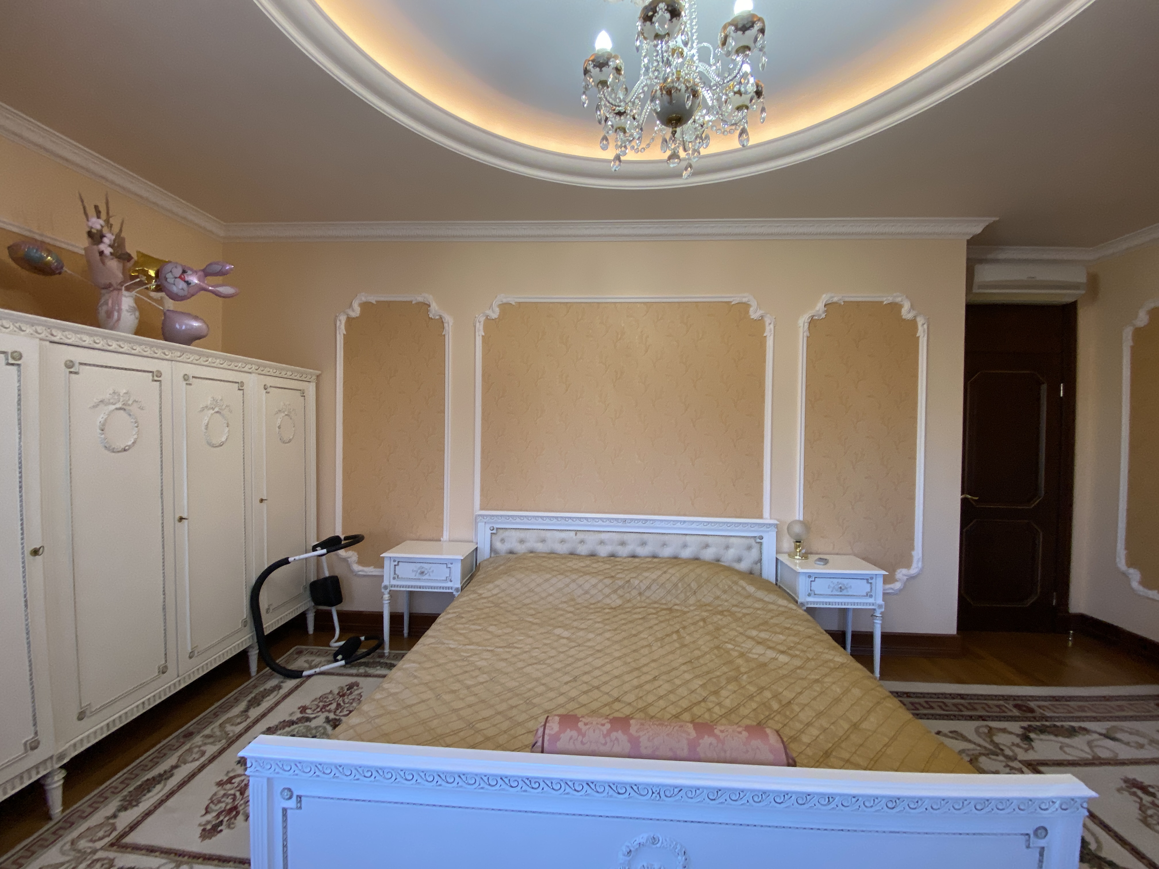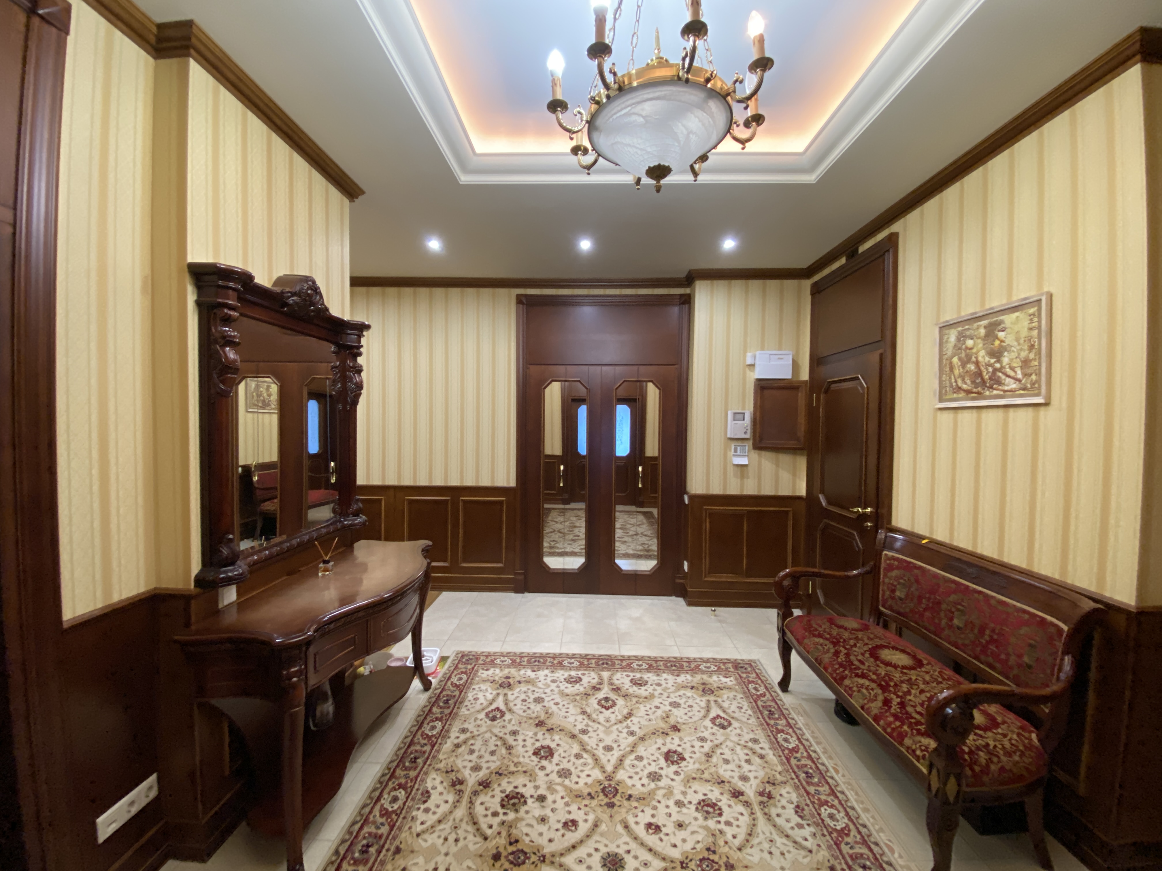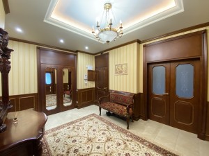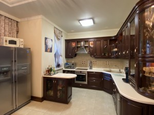 Квартира максимально укомплектована меблями: вбудовані кухонні меблі, столи, стільці, багато шаф, поличок, гардеробна з дзеркалами/підсвіткою/зонована, двоспальні ліжка, приліжкові тумби, дивани, крісла, декілька трюмо, комодів, тумб та багато іншого. Деякі меблі з інкрустацією.