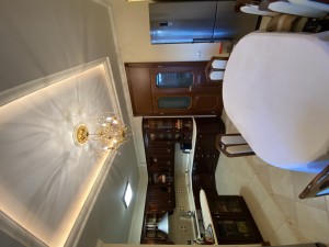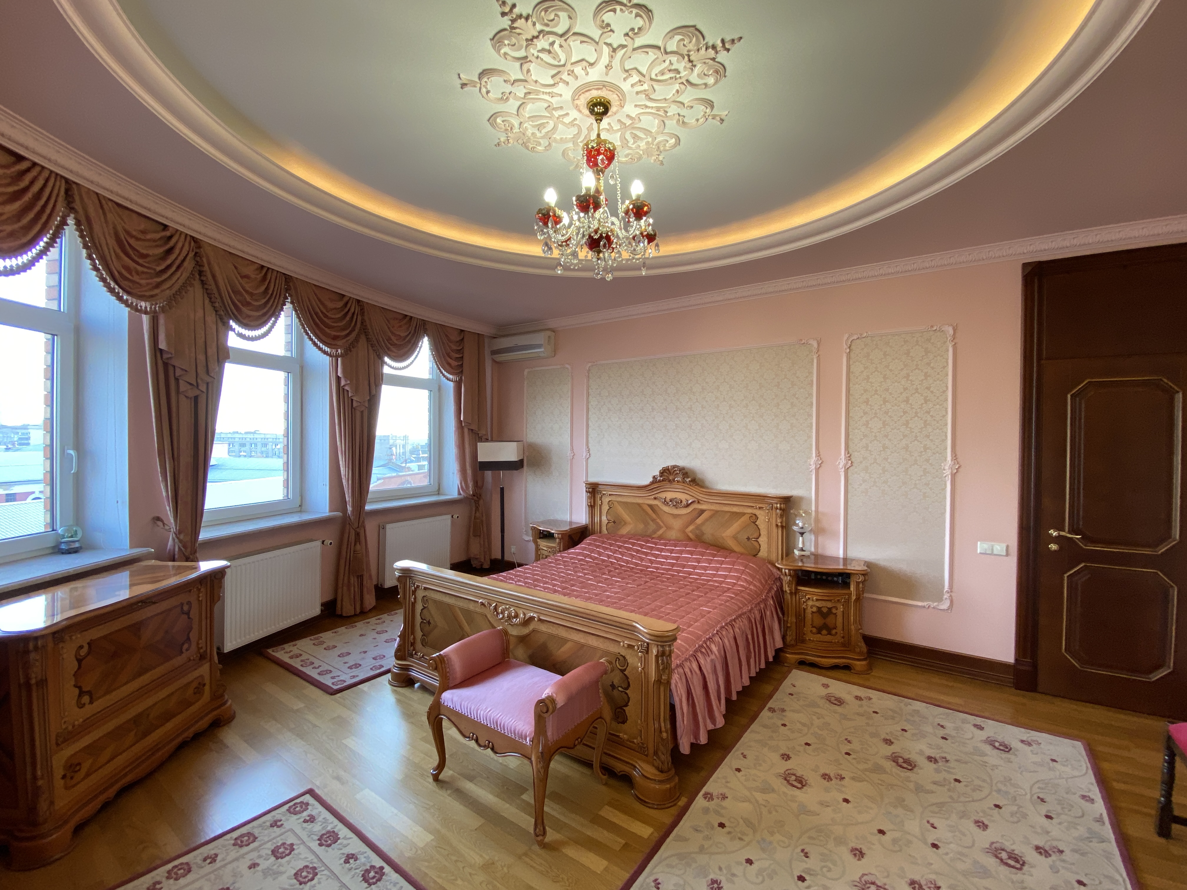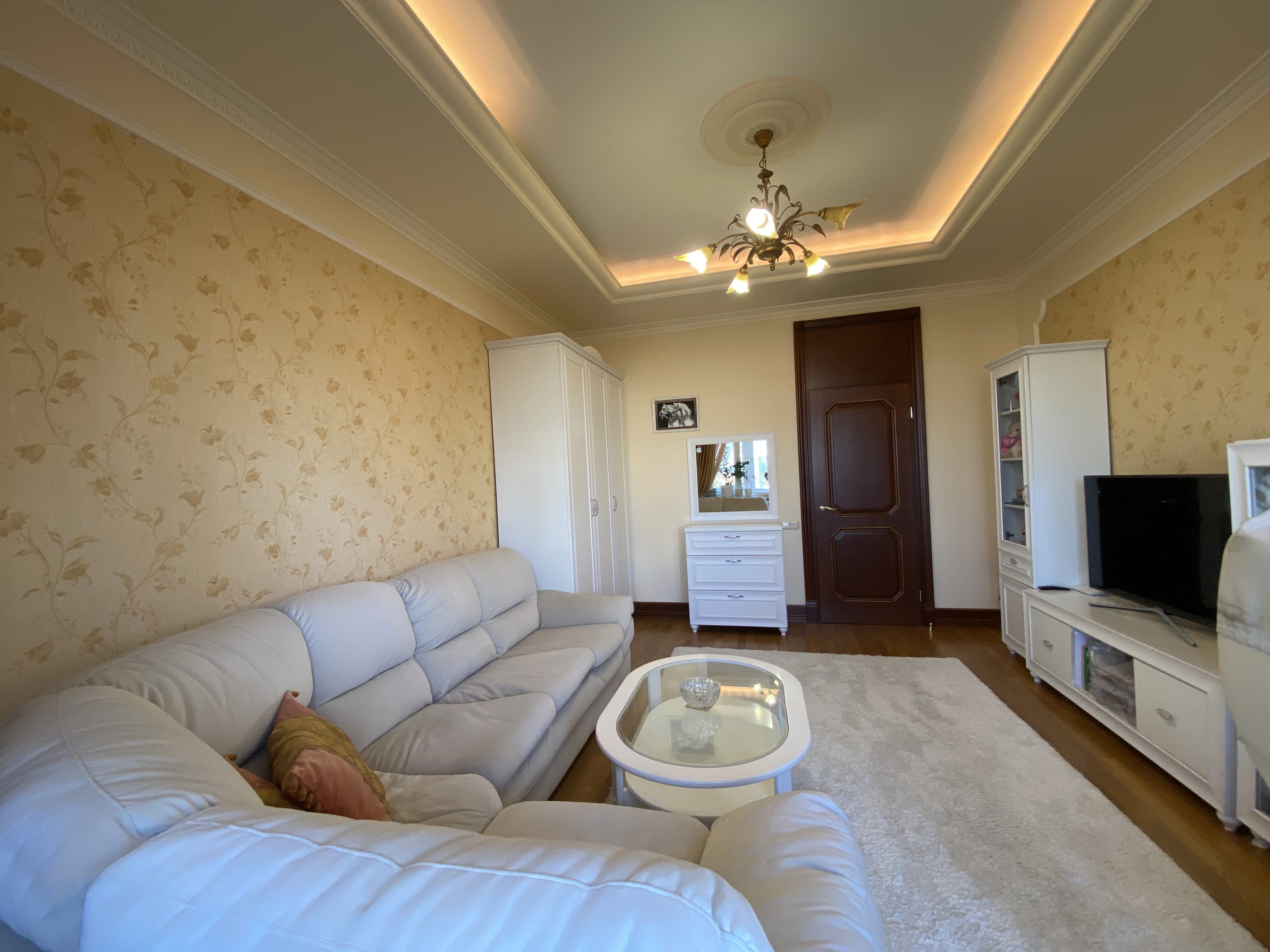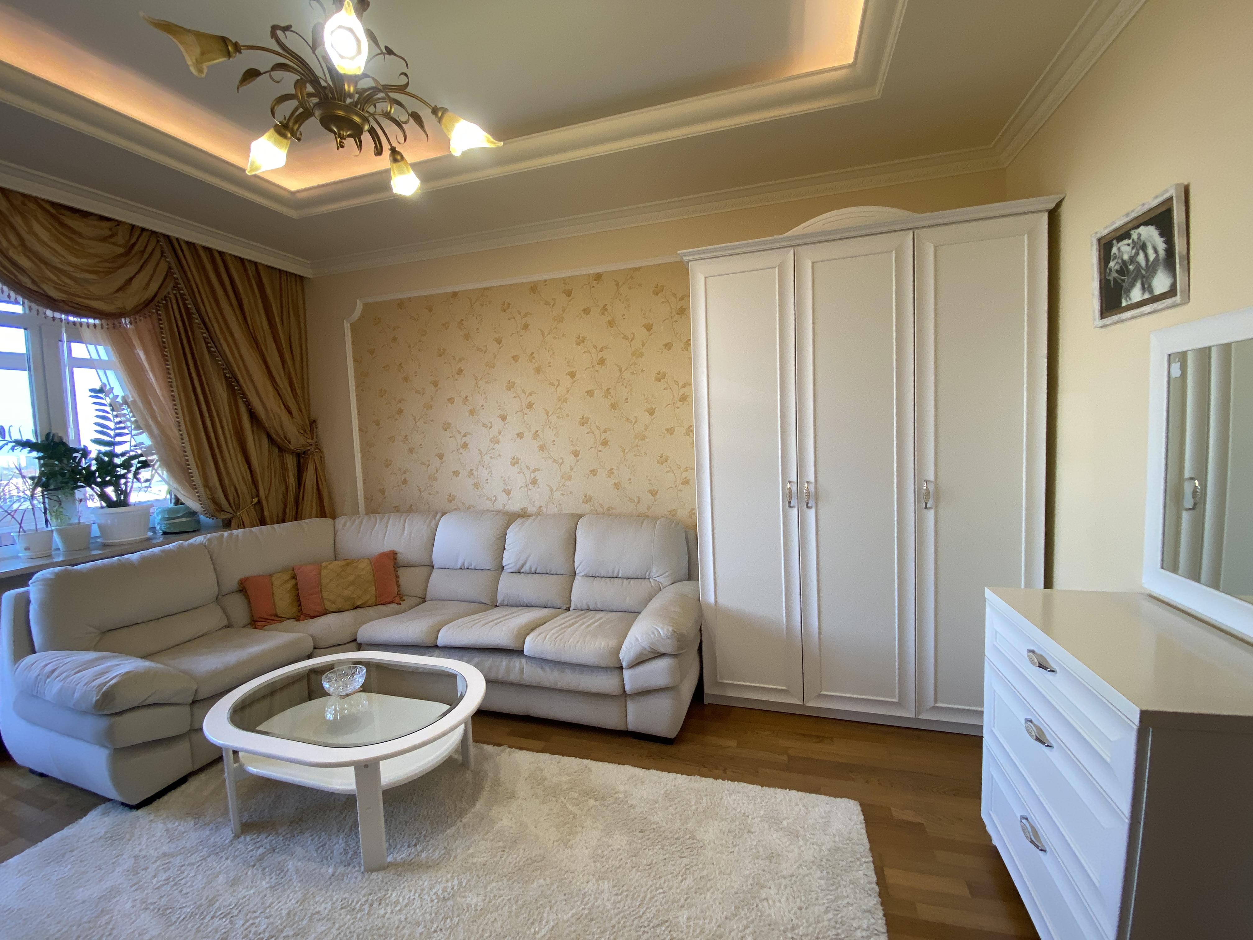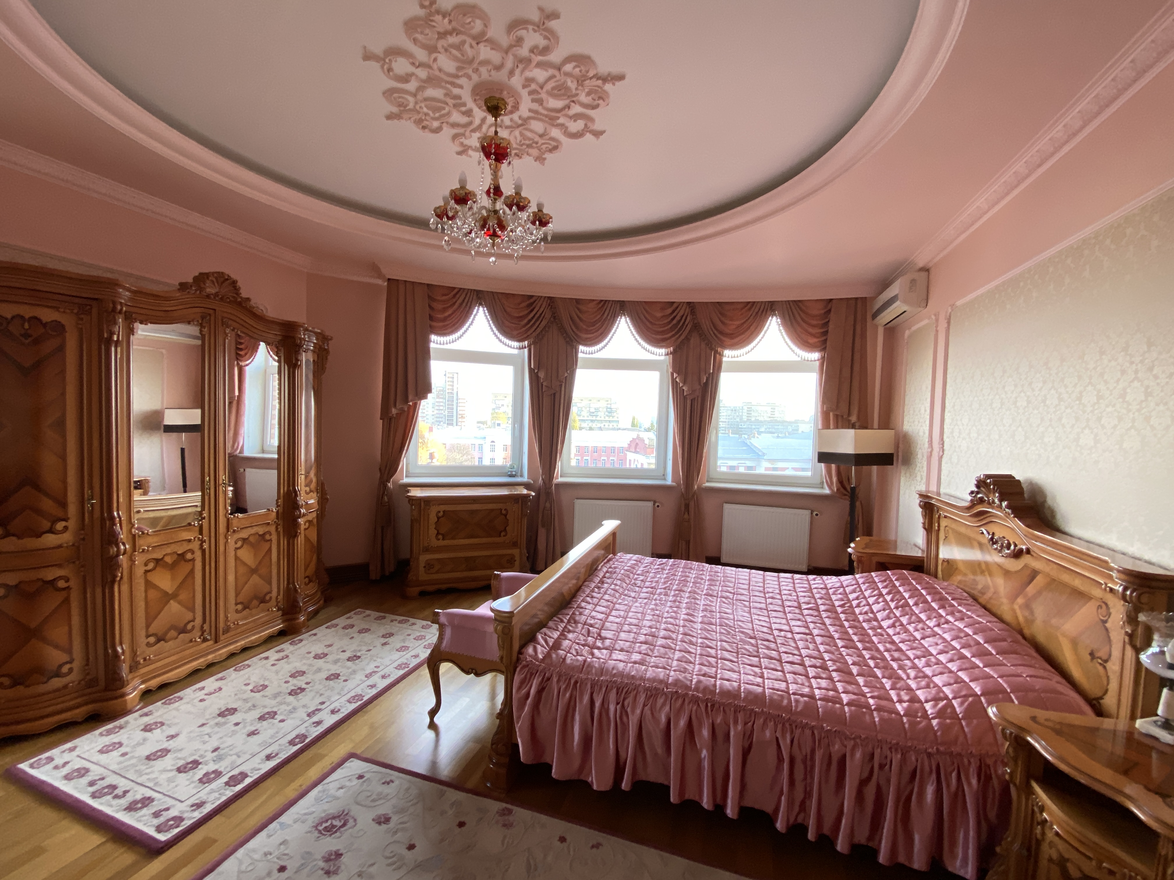 Квартира максимально укомплектована меблями: вбудовані кухонні меблі, столи, стільці, багато шаф, поличок, гардеробна з дзеркалами/підсвіткою/зонована, двоспальні ліжка, приліжкові тумби, дивани, крісла, декілька трюмо, комодів, тумб та багато іншого. Деякі меблі з інкрустацією.