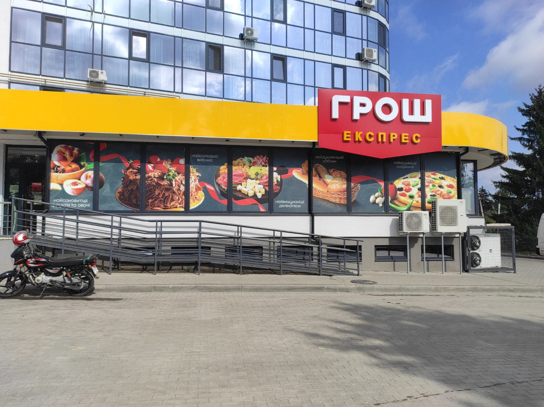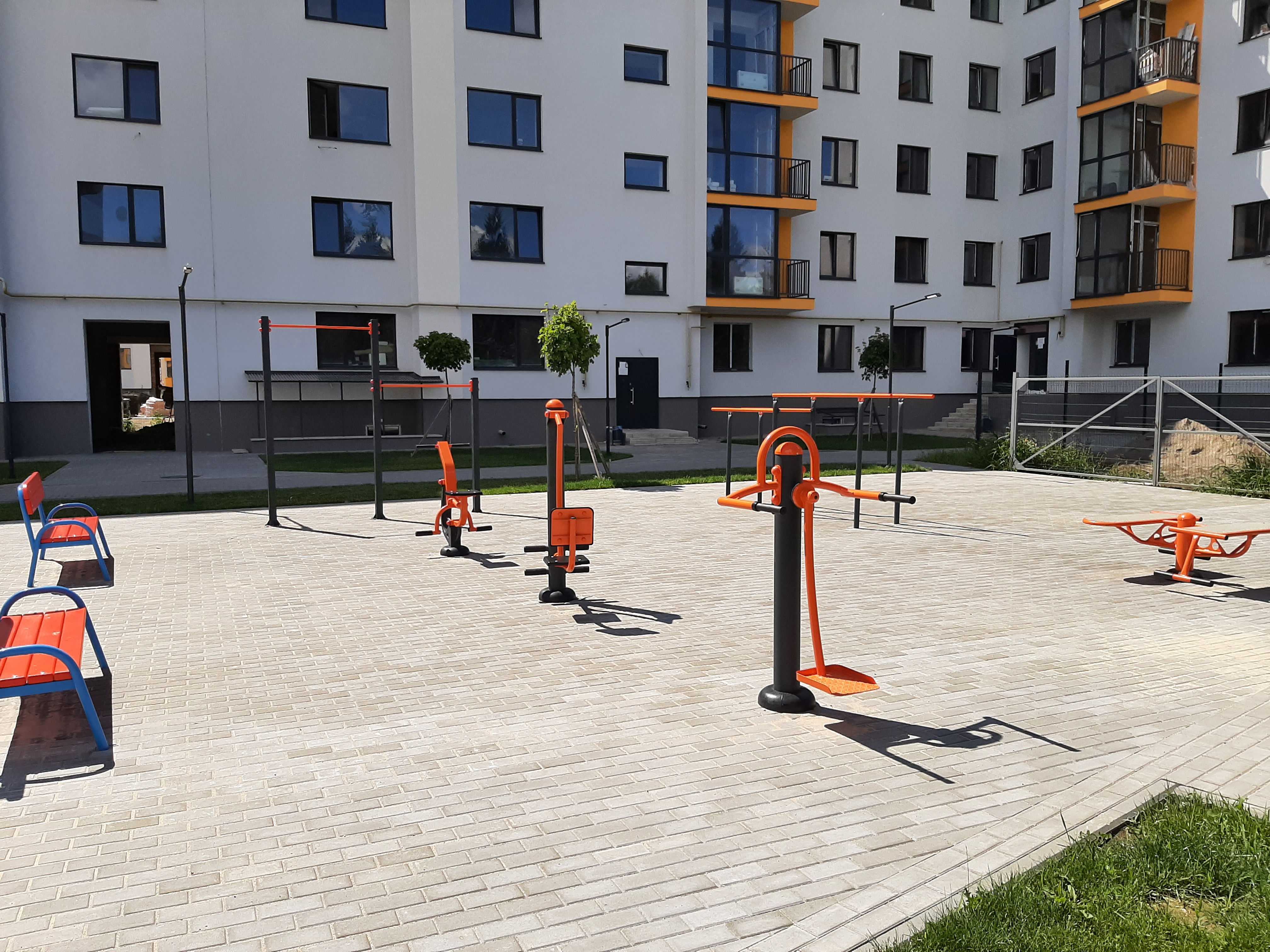 В комплексі : продовольчі магазини (в т.ч. «Грош»), салон краси, кав’ярня, Нова пошта, аптека, магазин промислових товарів, дитячі майданчики,.