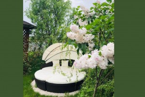 Велика зона відпочинку з бесідками та садовими шезлонгами.