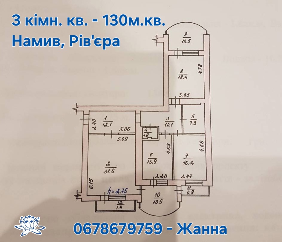 Три окремі кімнати (31,6 м + 16,2 м + 18,4 м), 2 великі лоджії, 2 балкони, 2 санвузли.
