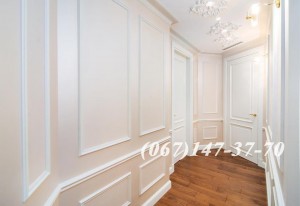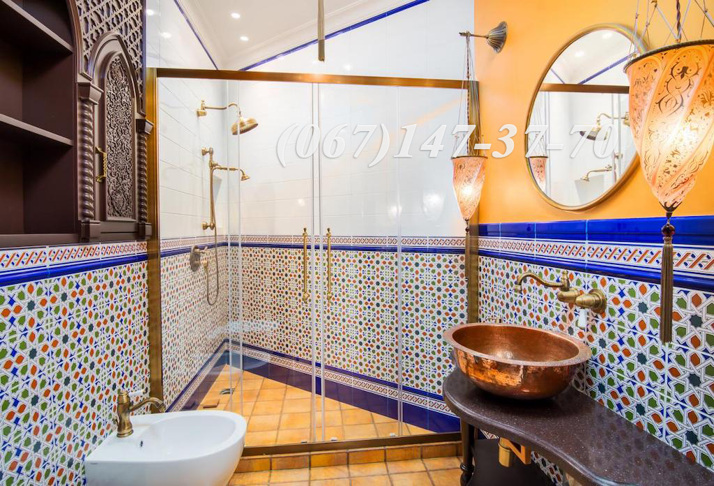 Мрамор в санузлах и на кухне. Дубовый паркет со специальными узорами.