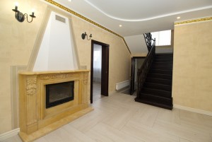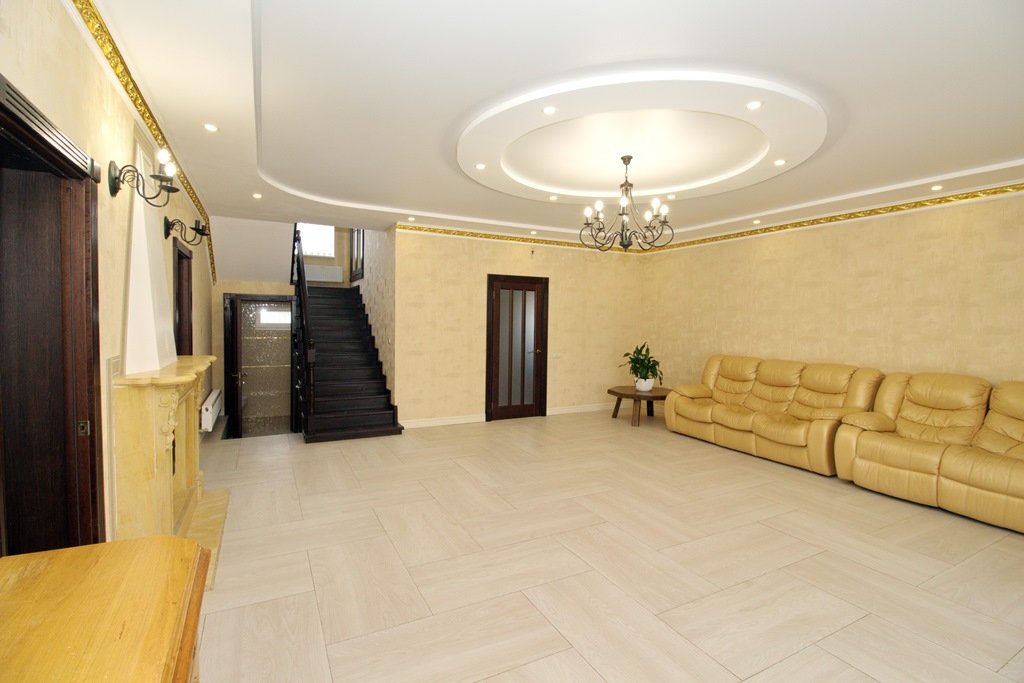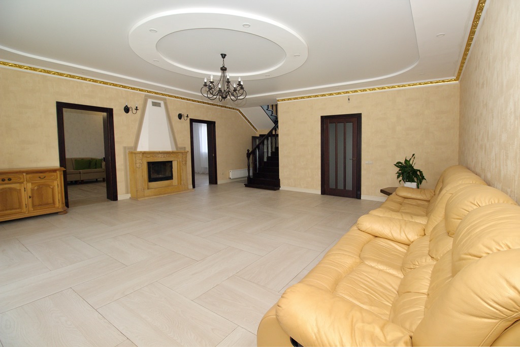 1- этаж : кухня-столовая с полным комплектом бытовой техники, гостиная ( 46м2) с камином, панорамными окнами и выходом на крытую террасу, гостевой санузел, гостевая комната, подсобное помещение, гардеробная, холл.