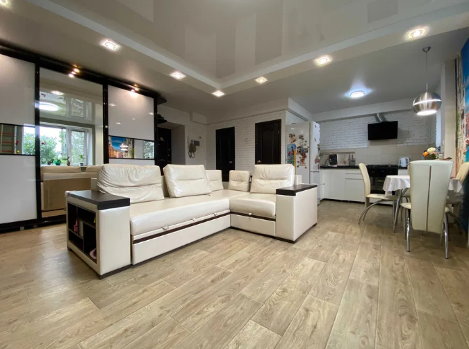 Предусмотрена возможность из студийного варианта, вернуться в Две полноценные изолированные комнаты с помощью гипсокартона или современной стеклянной конструкции. Потолки делались с учетом данной возможности.