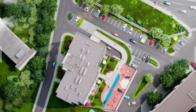 Спланированный внутренний двор комплекса с озелененным место для отдыха, детской игровой зоной и спортивной площадкой