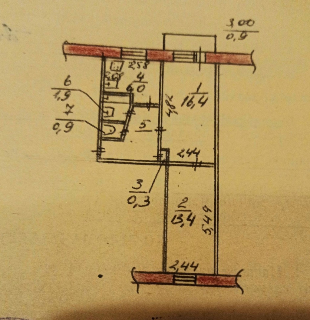 Общая площадь - 45 кв. м, жилая - 30 кв. м (16.4 + 13.4), кухня - 6 кв. м.