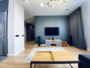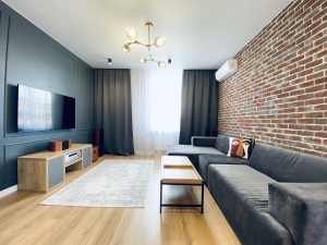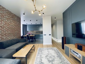 Квартира очень функциональная. Большая кухня-гостиная со столовой зоной, спальная комната, детская, есть кладовая.