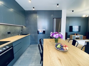 В квартире остаётся вся встроенная мебель. Установлена кухня. Меблирована ванная комната. Шкафы и рабочие места в спальной комнате и детской. Кладовая. Множество мест для хранения. Большой стол с удобными стульями. Встроенна микроволновая печь Whirlpool, вытяжка Perfelli, посудомойка Bosch, кухонный смеситель Franke, индукционная варочная поверхность Samsung.