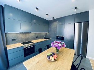 Для мебели использованы самые лучшие материалы. Столешница и ДСП EGGER (Австрия). Вся фурнитура BLUM. Крашенные фасады с фрезерованными ручками. Система открытия фасадов нажатием BLUM. LED-подсветка с сенсорным выключателем.