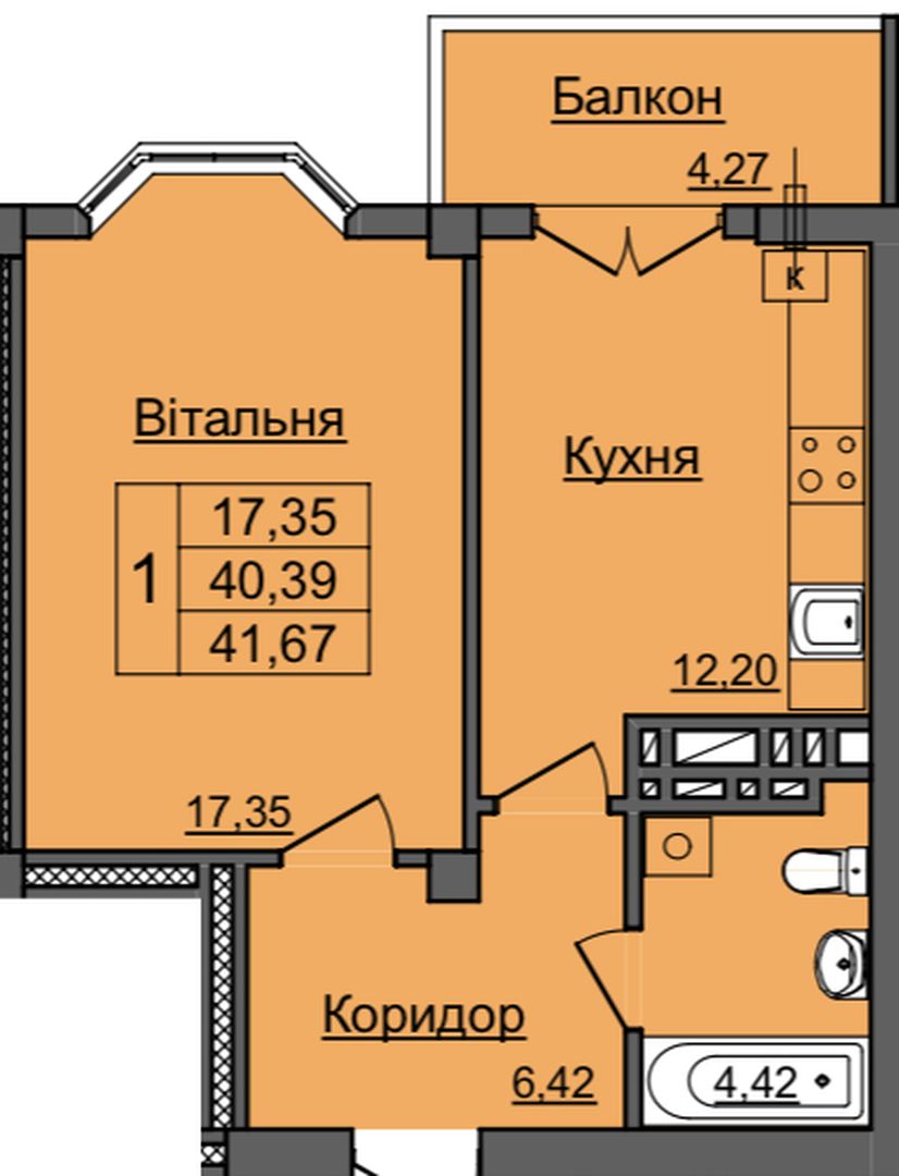 Загальна площа: 42 кв.м