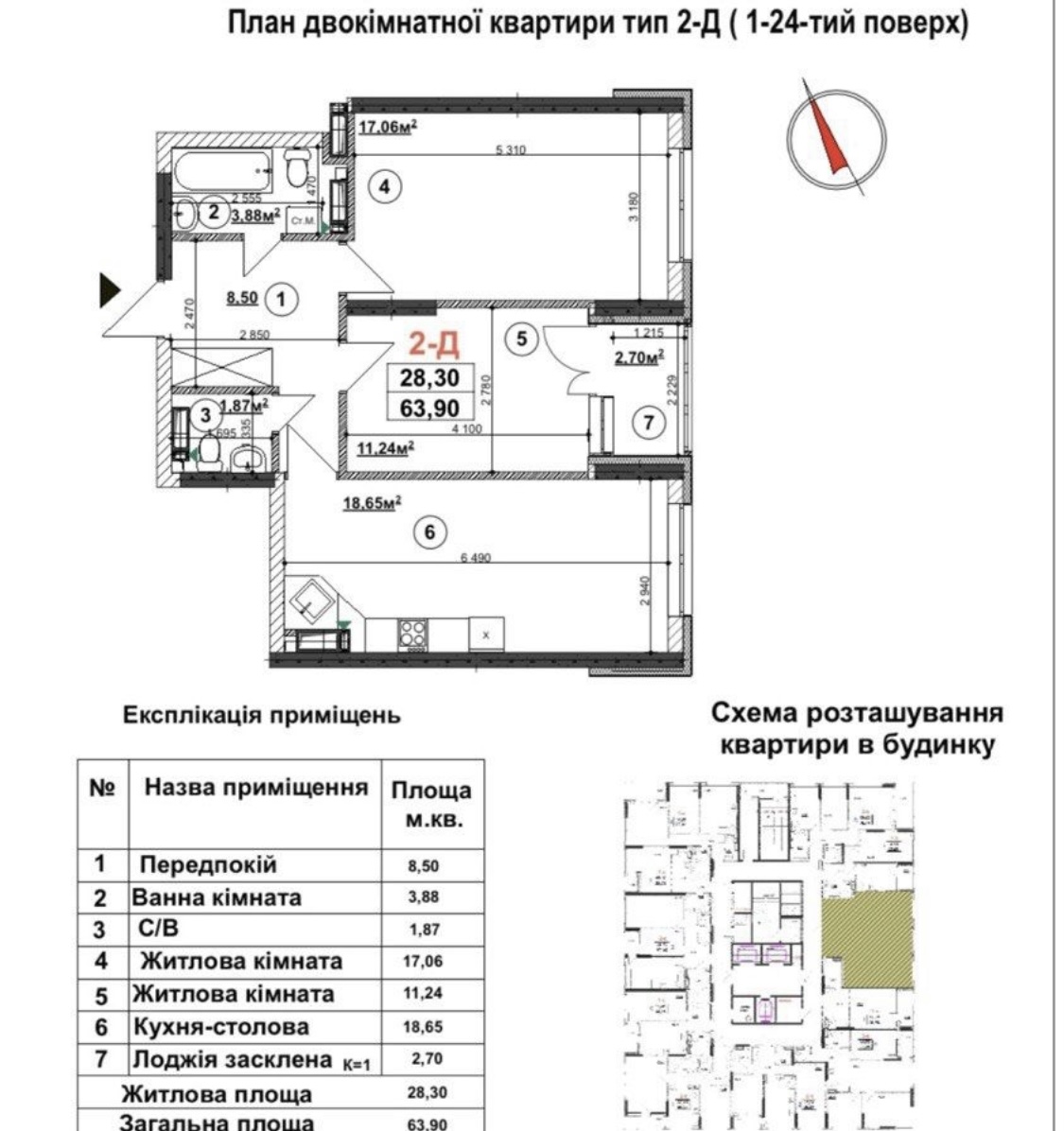 Загальна площа 63,90 кв.м, житлова площа 28,30 кв.м, кухня-вітальня 18,65 кв.м.,