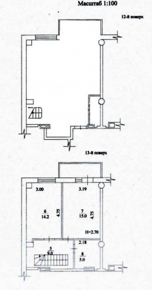 Квартира розташована на 12 та 13 поверсі 13-поверхового будинку.